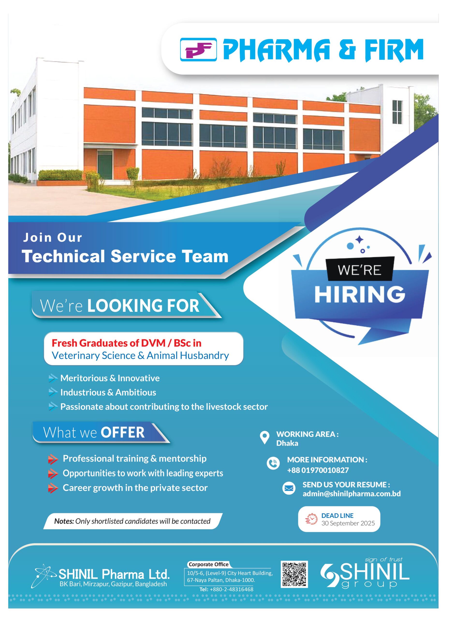 দেশের অন্যতম এগ্রোবেইজড প্রতিষ্ঠান সিনিল গ্রুপের অঙ্গ প্রতিষ্ঠান ফার্মা এণ্ড ফার্ম সম্প্রতি নিয়োগ বিজ্ঞপ্তি প্রকাশ করেছে। প্রতিষ্ঠানটি তাদের টেকনিক্যাল সার্ভিস টিমে লোকবল নিয়োগ দেবে। ফার্মা এণ্ড ফার্ম-এ স্বপ্নের ক্যারিয়ার গড়তে আগ্রহী প্রার্থীগণ আপডেট সিভি আগামী ৩০ সেপ্টেম্বর ২০২৫ এর মধ্যে admin@shinilpharma.com.bd মেইলের মাধ্যমে আবেদন করতে হবে।